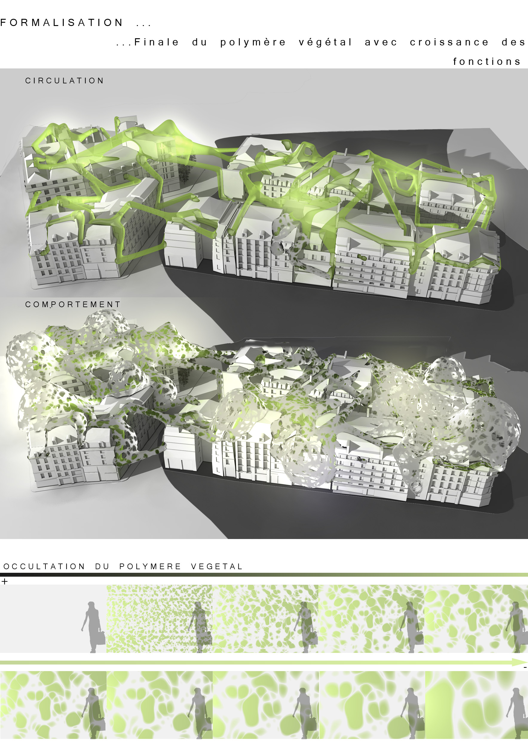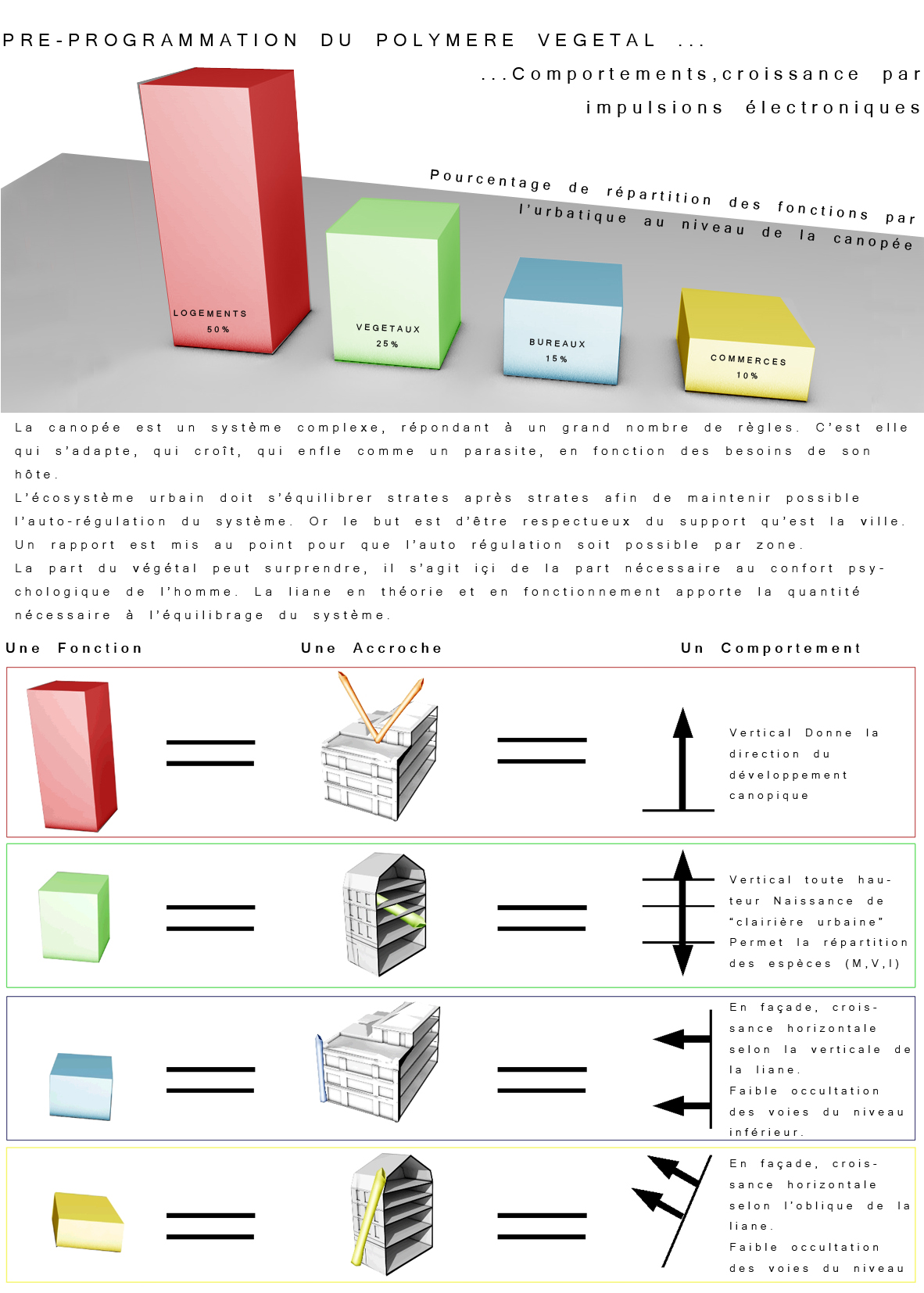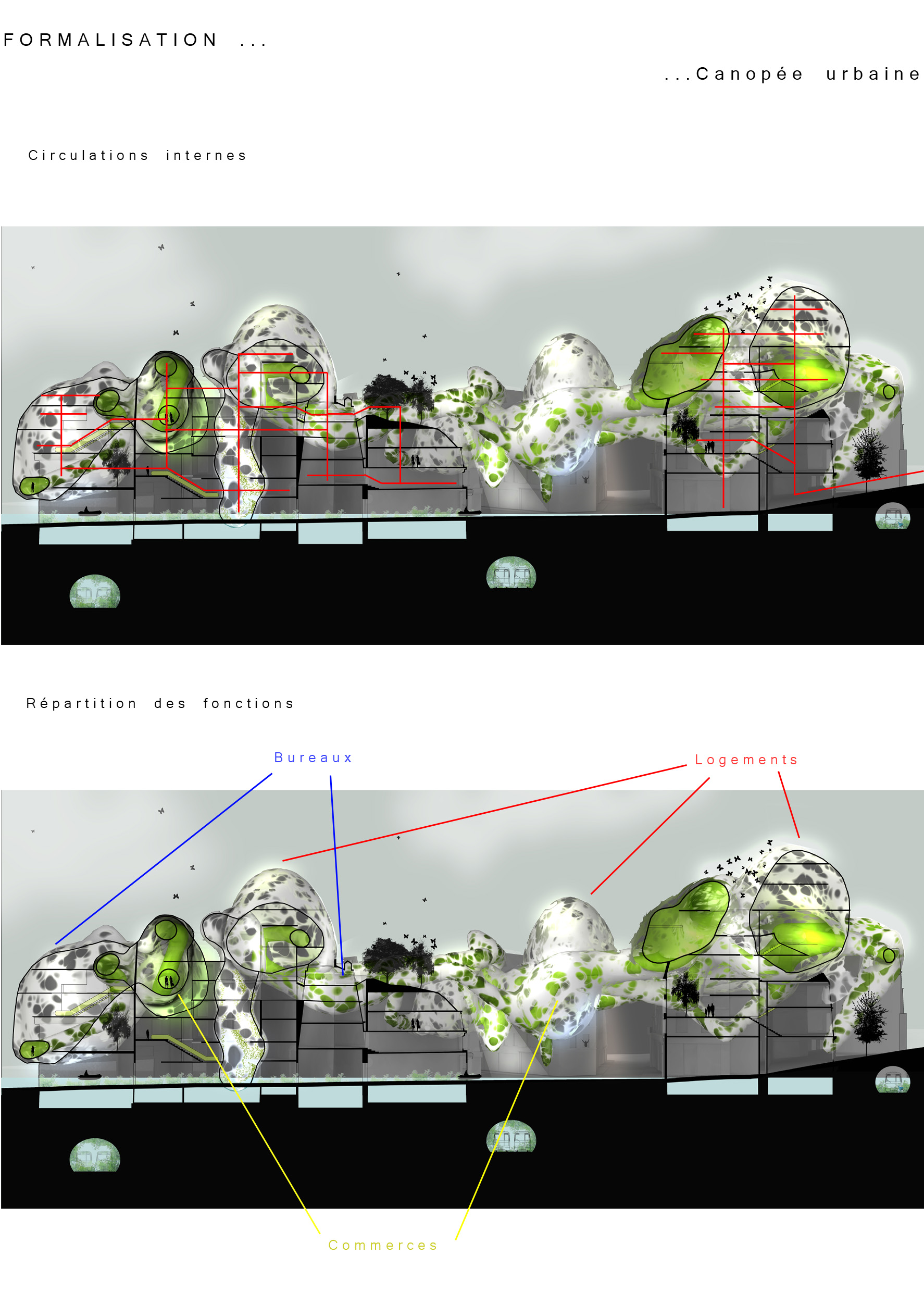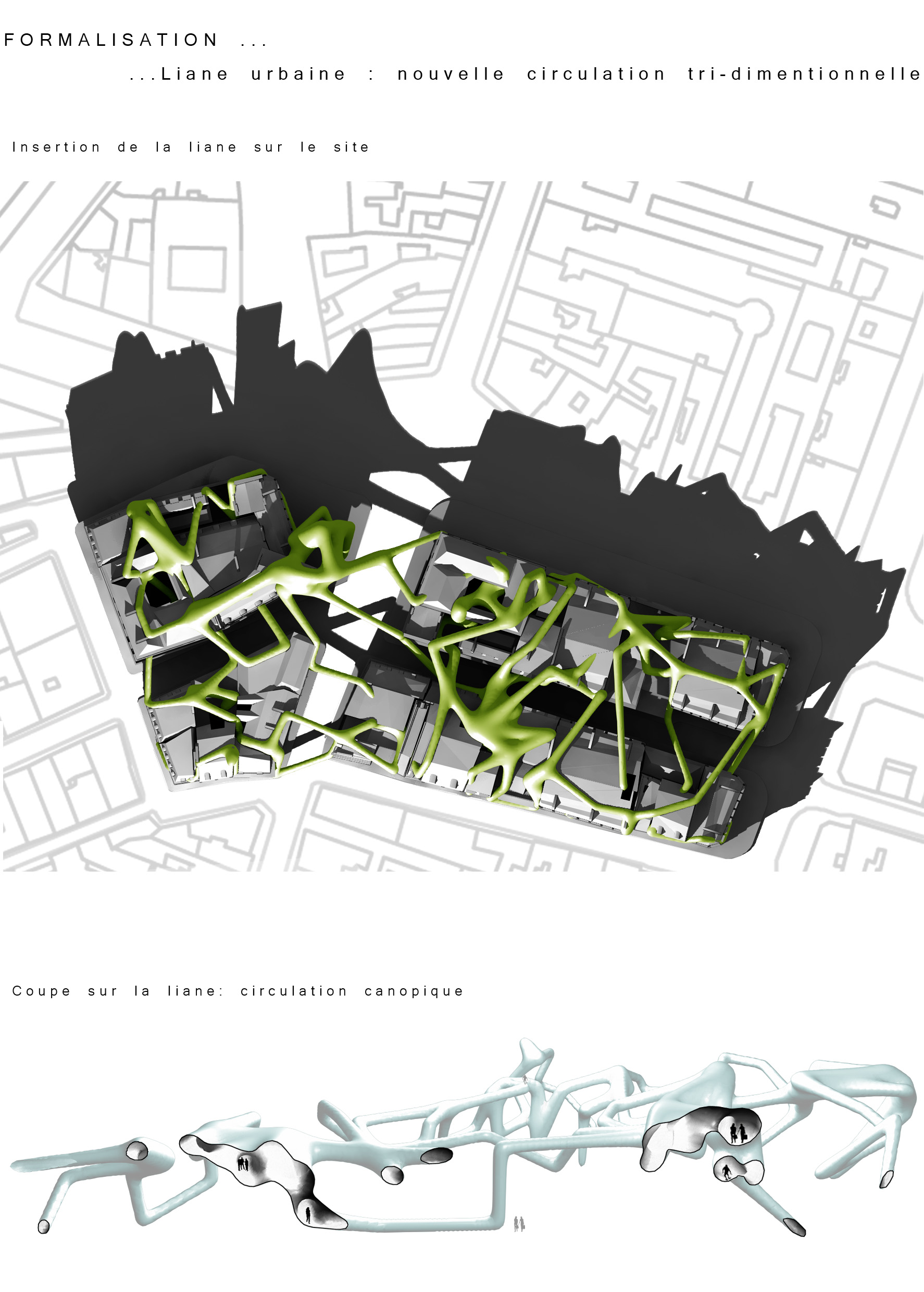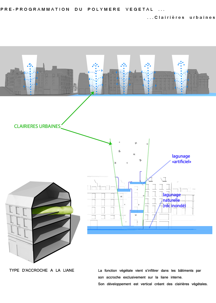 2100 : 10 milliards d’hommes sur Terre dont la moitié vivra dans les villes. Même si l’échéance parraît éloigné, il est de notre devoir de nous en préoccuper. D’amorcer une démarche comportementale, d’imaginer notre futur patrimoine. Aujourd’hui, la ville s’étend. Ses limites deviennent imprécises, comme floues. La ville se transforme, dessinant de nouvelles formes urbaines. Mais jusqu’à quel point ? La notion de densité soulève controverses et incompréhensions. La ville est un espace dense : elle facilite le mélange des fonctions et l’optimisation des réseaux. Plus économes en espace, les villes agglomérées offrent un espace public vivant, porteur de liens sociaux et d’échanges. Le problème actuel de la ville dense réside dans la définition de seuils de saturation du sol enrayant toute possibilité de constructions nouvelles. Toutes possibilités d’évolution, de transformations internes, de poursuites d’un futur patrimoine. La ville cantonnée ne risque-t-elle pas de se figer et de perdre sa vitalité ? Tout pousse l’homme d’aujourd’hui a se questionner sur son futur, lié étroitement avec la planète. De quoi demain sera fait ? Il devient urgent de se préoccuper de notre planete. Cependant pouvons-nous encore inverser la tendance ? L’homme, individualiste et materialiste, commence juste à prendre conscience de ce futur en suspend. Seulement il est trop tard, les dégats ayant déja été faits, nous ne pouvons aujourd’hui que limiter les impacts futurs. Plusieurs problemes se posent à l’heure actuelle, concernant ET notre planète ET les sociétés qui s’y créent. Il suffit de regarder autour de nous, d’ouvrir les yeux, pour découvrir où les travers de la société nous emmenent. La vision de notre futur , quelle soit littéraire ou cinématographique, n’est guère agréable : des sociétés totalitaires . Il s’agira d’expérimenter les possibilités d’avenirs de société et planète.CorpusParler de « canopée » revient à parler d’un concept, d’un principe. Afin que l’expérimentation d’une canopée urbaine s’impose d’elle-même, expliquer les étapes d’une telle démarche est nécéssaire. Au départ, le lecteur doit se détacher de ce qu’il connaît, de ce qu’il considère comme sa réalité. La seule, l’unique. Cette obstination a vouloir toujours tout expliquer. Il se doit de voir au-delà de ce qu’il connaît, ou croit connaître, d’extrapoler son référentiel, voir même de le mettre de côté un instant, afin de s’ouvrir sur une possible relecture de son environnement. Sa grandeur ne se trouve pas confinée à ce référentiel géocentrique mais s’organise de part et d’autre. En se déformatant de sa société et de ses modes de pensées, les œillères tombent laissant apercevoir des perspectives d’avenir bien différentes. Une fois délesté de ce superflu, l’homme peut entreprendre et comprendre l’ascension canopique. Ainsi, la planète Terre n’est rien d’autre qu’un organisme vivant, appelé Gaïa, au sein d’un organisme plus gros. Je parle, ici, d’un organisme homéostasique, c’est-à-dire permettant une caractéristique d’auto-régulation. Extrapolons un peu : le système solaire serait alors un système lui aussi homéostasique dépendant de l’auto-régulation propre des organismes le composant…etc… L’infiniment grand et l’infiniment petit s’imbriquent alors complètement. Ils dépendent l’un de l’autre. Gaïa évolue, se modifie et maintient ce fameux équilibre depuis 4,55 milliards d’années. Seulement, il y 15 000 ans, un sous-organisme s’est mis à proliférer, participant au système général dans un premier temps, il faisait partie intégrante du système. Puis, progressivement, semblable à un virus,envahissant chaque recoin de son hôte,. Il devient nuisible. Il donne la fièvre à Gaïa. Finalement, et si, l’infiniment grand pour le référentiel humain n’était que l’infiniment petit dans un autre référentiel ? L’ Homme, détaché de son référentiel naturé et sans aucun repère, peut ainsi être réceptif à de nouveaux stimuli. Il est capable de relire sa réalité, pour voir au-delà. Il est prêt à étudier un écosystème auto-régulateur présent dans son référentiel: la forêt Amazonienne. Il peut se projeter, transposer sans conformisme ni limites. Les troncs d’arbres massifs et imposants deviennent des bâtiments, les différents génotypes, des fonctions, les lianes grimpantes et sautillantes se transforment soudainement en un réseau principale reliant les réseaux de sève interne aux arbres comme des réseaux secondaires. Ces lianes sont le liant de cette ville végétale. Les individus remplacent alors les feuilles composant cette densité ressentie en ville. Une vision plus extrême tendrait vers: le sous-bois devient la ville d’aujourd’hui, les troncs d’arbres sont une foret de poteaux, soutenant la masse de la société comparable au feuillage. De nature insatisfaite, l’Homme cherche plus loin. Il ressent la présence d’un élément supplémentaire, semblable à un élément protecteur. La pluie atteint à peine le sol, les rayons du soleil ne parviennent pas jusqu’à lui non plus, et la biomasse entreprend l’ascension vers les hauteurs. Ainsi dans l’écosystème végétal il existe un endroit de concentration, de rencontres, de contact entre ces éléments. Il s’agit de la canopée. Une interface entre la Terre et l’atmosphère. Comme le liant entre deux mondes juxtaposés. Un espace d’absorption, de transformation, d’adaptation. Cette canopée représente la pièce manquante de l’écosystème humain afin de permettre l’auto régulation naturel du système mis dans un nouveau référentiel. Un biologiste explique très bien l’image issue de ce concept. « Quand on marche dans la forêt, on se trouve sous la moquette. Le dessus de la moquette, c