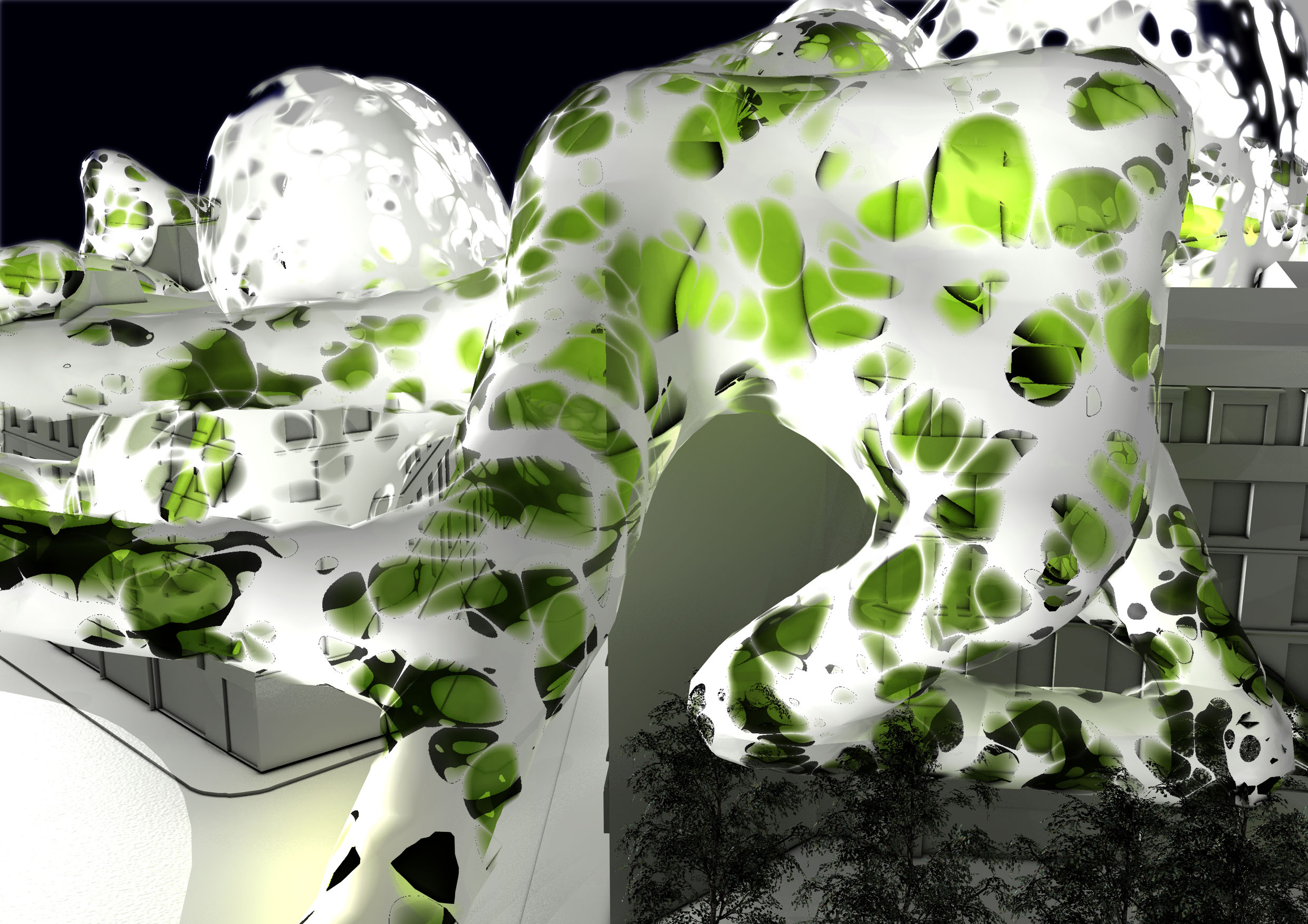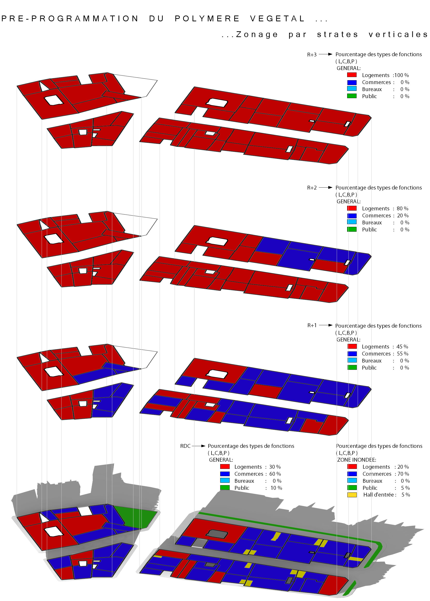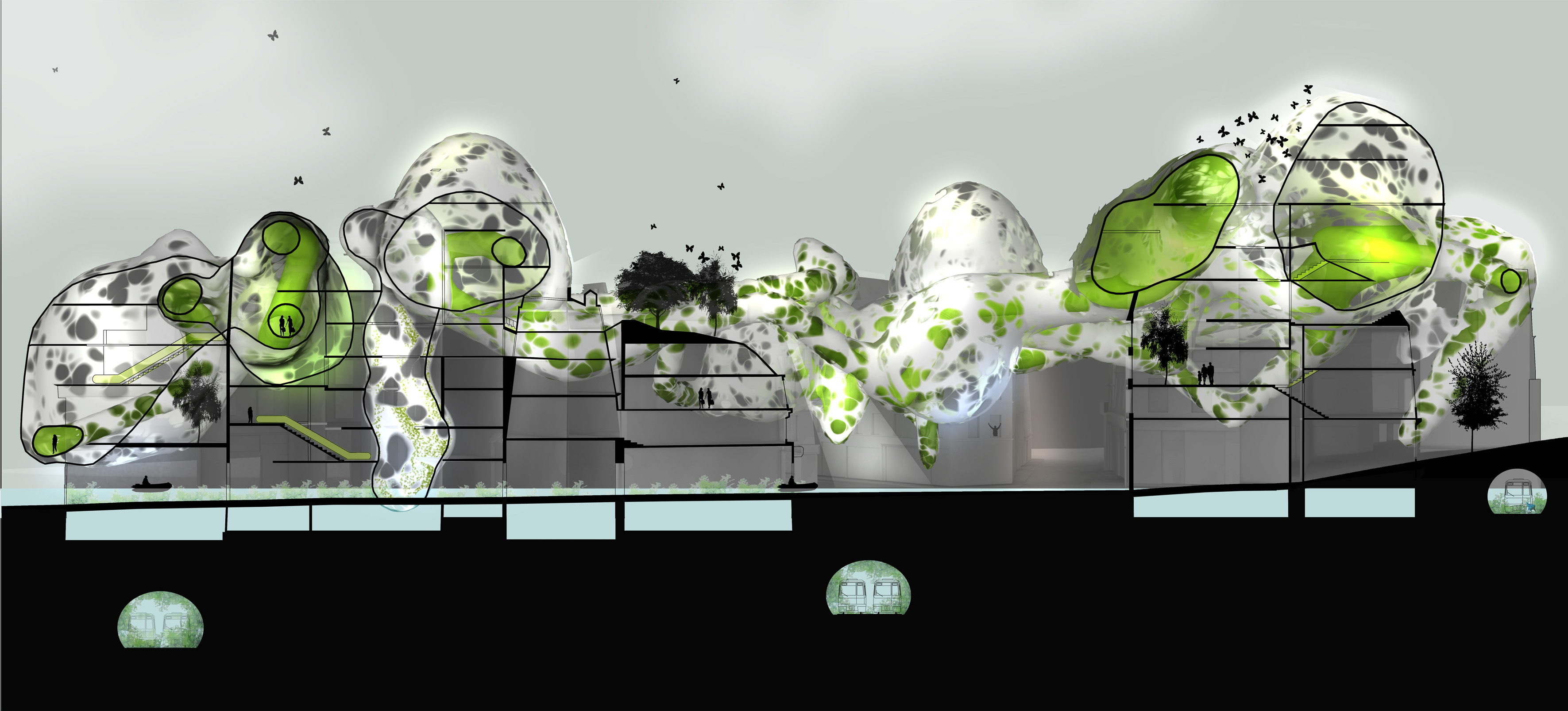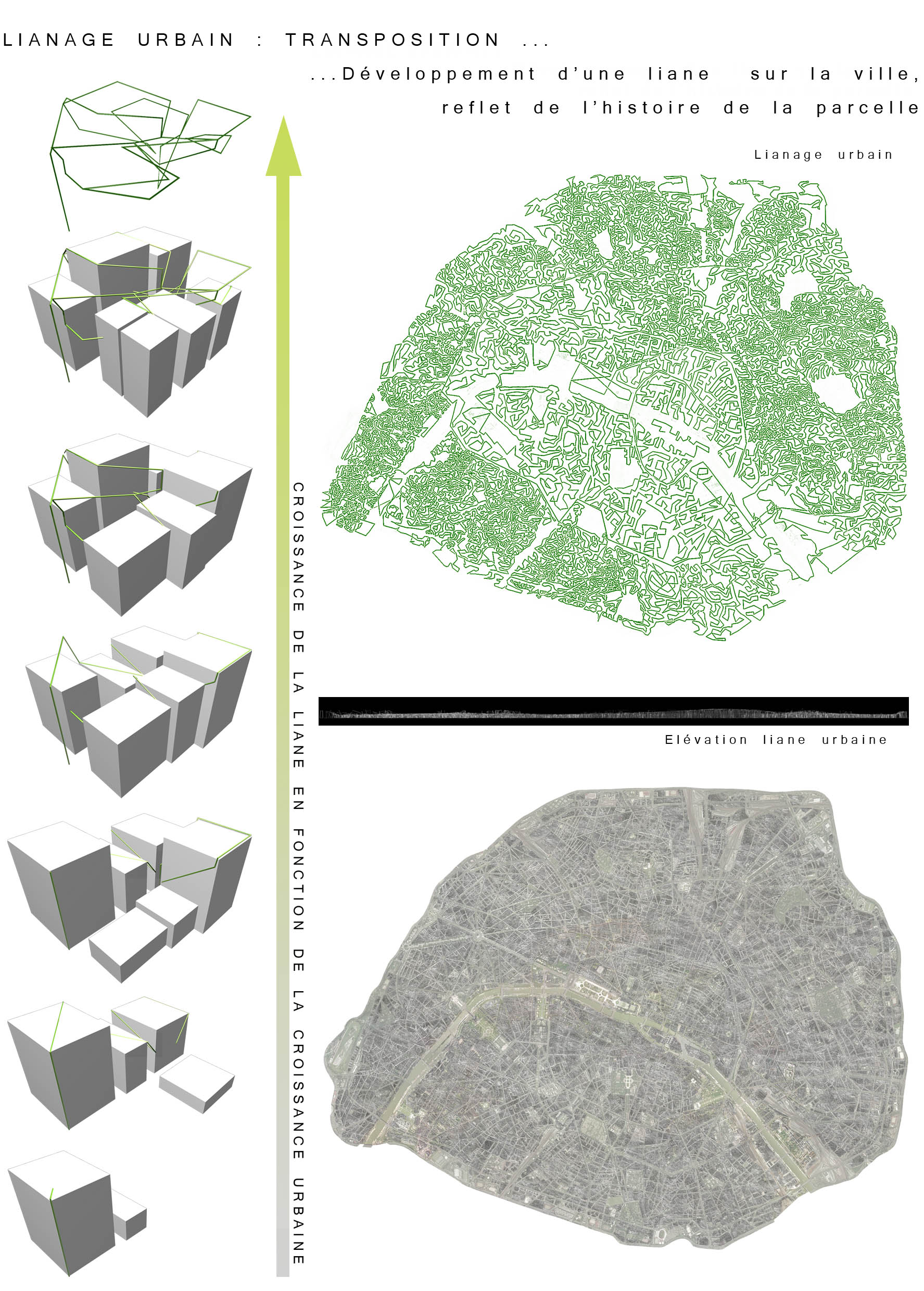 2100 : 10 milliards d’hommes sur Terre dont la moitié vivra dans les villes. Même si l’échéance parraît éloigné, il est de notre devoir de nous en préoccuper. D’amorcer une démarche comportementale, d’imaginer notre futur patrimoine. Aujourd’hui, la ville s’étend. Ses limites deviennent imprécises, comme floues. La ville se transforme, dessinant de nouvelles formes urbaines. Mais jusqu’à quel point ? La notion de densité soulève controverses et incompréhensions. La ville est un espace dense : elle facilite le mélange des fonctions et l’optimisation des réseaux. Plus économes en espace, les villes agglomérées offrent un espace public vivant, porteur de liens sociaux et d’échanges. Le problème actuel de la ville dense réside dans la définition de seuils de saturation du sol enrayant toute possibilité de constructions nouvelles. Toutes possibilités d’évolution, de transformations internes, de poursuites d’un futur patrimoine. La ville cantonnée ne risque-t-elle pas de se figer et de perdre sa vitalité ? Tout pousse l’homme d’aujourd’hui a se questionner sur son futur, lié étroitement avec la planète. De quoi demain sera fait ? Il devient urgent de se préoccuper de notre planete. Cependant pouvons-nous encore inverser la tendance ? L’homme, individualiste et materialiste, commence juste à prendre conscience de ce futur en suspend. Seulement il est trop tard, les dégats ayant déja été faits, nous ne pouvons aujourd’hui que limiter les impacts futurs. Plusieurs problemes se posent à l’heure actuelle, concernant ET notre planète ET les sociétés qui s’y créent. Il suffit de regarder autour de nous, d’ouvrir les yeux, pour découvrir où les travers de la société nous emmenent. La vision de notre futur , quelle soit littéraire ou cinématographique, n’est guère agréable : des sociétés totalitaires . Il s’agira d’expérimenter les possibilités d’avenirs de société et planète.CorpusParler de « canopée » revient à parler d’un concept, d’un principe. Afin que l’expérimentation d’une canopée urbaine s’impose d’elle-même, expliquer les étapes d’une telle démarche est nécéssaire. Au départ, le lecteur doit se détacher de ce qu’il connaît, de ce qu’il considère comme sa réalité. La seule, l’unique. Cette obstination a vouloir toujours tout expliquer. Il se doit de voir au-delà de ce qu’il connaît, ou croit connaître, d’extrapoler son référentiel, voir même de le mettre de côté un instant, afin de s’ouvrir sur une possible relecture de son environnement. Sa grandeur ne se trouve pas confinée à ce référentiel géocentrique mais s’organise de part et d’autre. En se déformatant de sa société et de ses modes de pensées, les œillères tombent laissant apercevoir des perspectives d’avenir bien différentes. Une fois délesté de ce superflu, l’homme peut entreprendre et comprendre l’ascension canopique. Ainsi, la planète Terre n’est rien d’autre qu’un organisme vivant, appelé Gaïa, au sein d’un organisme plus gros. Je parle, ici, d’un organisme homéostasique, c’est-à-dire permettant une caractéristique d’auto-régulation. Extrapolons un peu : le système solaire serait alors un système lui aussi homéostasique dépendant de l’auto-régulation propre des organismes le composant…etc… L’infiniment grand et l’infiniment petit s’imbriquent alors complètement. Ils dépendent l’un de l’autre. Gaïa évolue, se modifie et maintient ce fameux équilibre depuis 4,55 milliards d’années. Seulement, il y 15 000 ans, un sous-organisme s’est mis à proliférer, participant au système général dans un premier temps, il faisait partie intégrante du système. Puis, progressivement, semblable à un virus,envahissant chaque recoin de son hôte,. Il devient nuisible. Il donne la fièvre à Gaïa. Finalement, et si, l’infiniment grand pour le référentiel humain n’était que l’infiniment petit dans un autre référentiel ? L’ Homme, détaché de son référentiel naturé et sans aucun repère, peut ainsi être réceptif à de nouveaux stimuli. Il est capable de relire sa réalité, pour voir au-delà. Il est prêt à étudier un écosystème auto-régulateur présent dans son référentiel: la forêt Amazonienne. Il peut se projeter, transposer sans conformisme ni limites. Les troncs d’arbres massifs et imposants deviennent des bâtiments, les différents génotypes, des fonctions, les lianes grimpantes et sautillantes se transforment soudainement en un réseau principale reliant les réseaux de sève interne aux arbres comme des réseaux secondaires. Ces lianes sont le liant de cette ville végétale. Les individus remplacent alors les feuilles composant cette densité ressentie en ville. Une vision plus extrême tendrait vers: le sous-bois devient la ville d’aujourd’hui, les troncs d’arbres sont une foret de poteaux, soutenant la masse de la société comparable au feuillage. De nature insatisfaite, l’Homme cherche plus loin. Il ressent la présence d’un élément supplémentaire, semblable à un élément protecteur. La pluie atteint à peine le sol, les rayons du soleil ne parviennent pas jusqu’à lui non plus, et la biomasse entreprend l’ascension vers les hauteurs. Ainsi dans l’écosystème végétal il existe un endroit de concentration, de rencontres, de contact entre ces éléments. Il s’agit de la canopée. Une interface entre la Terre et l’atmosphère. Comme le liant entre deux mondes juxtaposés. Un espace d’absorption, de transformation, d’adaptation. Cette canopée représente la pièce manquante de l’écosystème humain afin de permettre l’auto régulation naturel du système mis dans un nouveau référentiel. Un biologiste explique très bien l’image issue de ce concept. « Quand on marche dans la forêt, on se trouve sous la moquette. Le dessus de la moquette, c