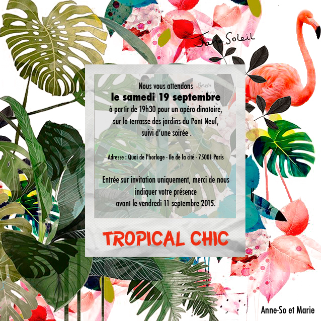 Création d’un save the date et d’une invitation pour les 35 ans de filles dans le vent. Le thème coloré qu’est « tropical chic » a permis la création d’un carton avec du peps. L’évènement ayant eu lieu sur la péniche « les jardins du pont neuf » avec la soirée de la bande organisée à l’étage supérieur.