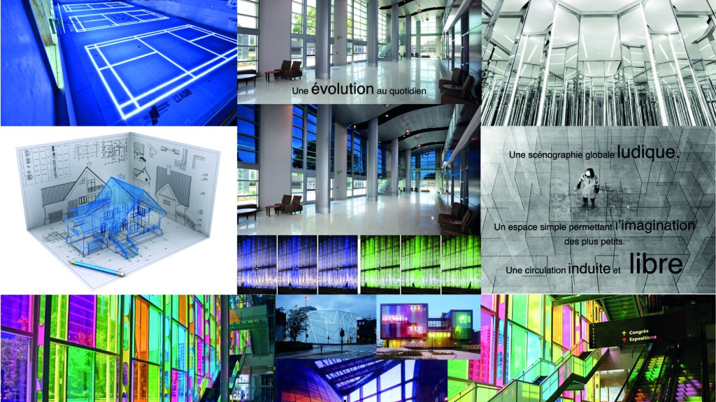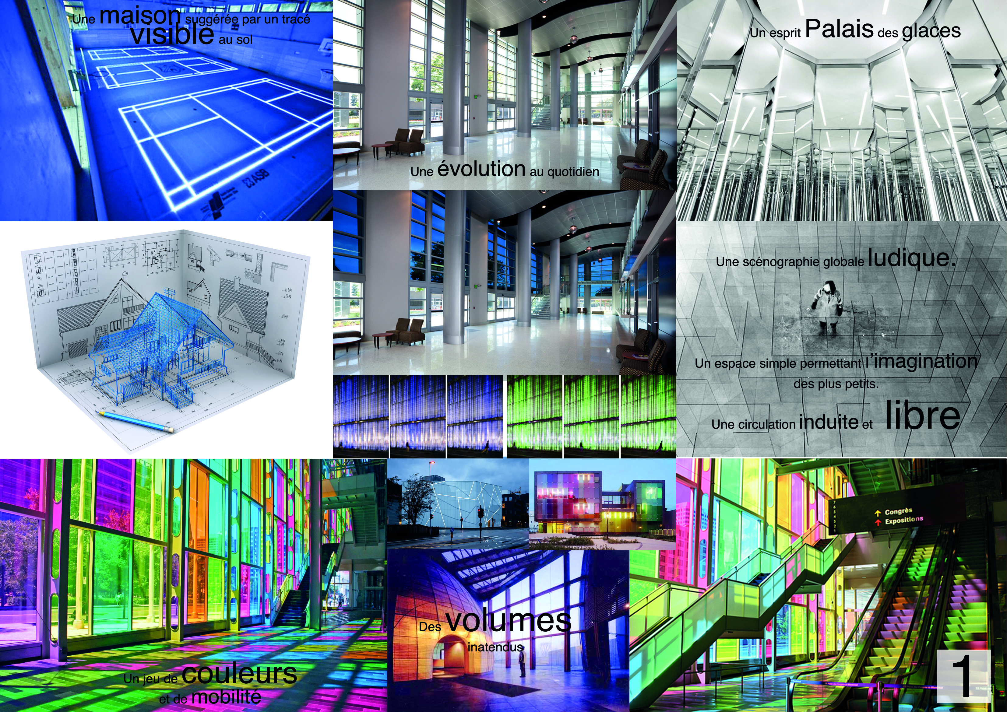 1 – L’enveloppe (planche 1) L’idée principale est de créer une scénographie globale ludique, basée sur l’esprit d’un palais des glaces. Au sol, seul le tracé de la maison est visible. L’utilisateur évolue dans un plan d’architect de la maison du futur. Cette mise en scène permettant une vision globale de l’espace et le développement de l’imaginaire de l’enfant.