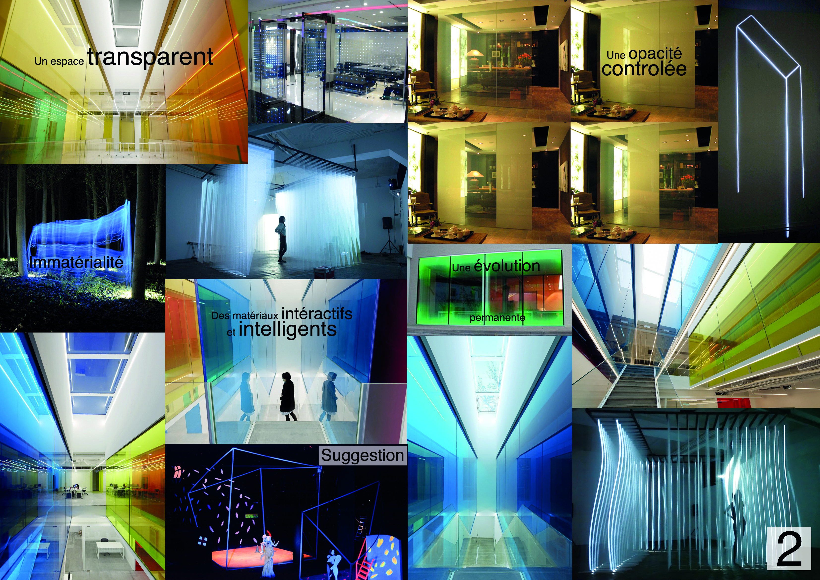 2 – Le cloisonnement (planche 2) Sur ce plan, des cloisons se dessinent et s’extrudent par endroit afin de délimiter des espaces d’expérimentations liées aux différentes pièces de la maison. La transparence étant l’axe principal, ce cloisonnement peut être suggéré par un encadrement, immatériel, par des murs lasers. Il s’agit içi de mettre en avant des matériaux intéractifs et intelligents comme des vitrages à opacité contrôlée. La maison du futur représente l’évolution permanente, la mobilité de la matière.
