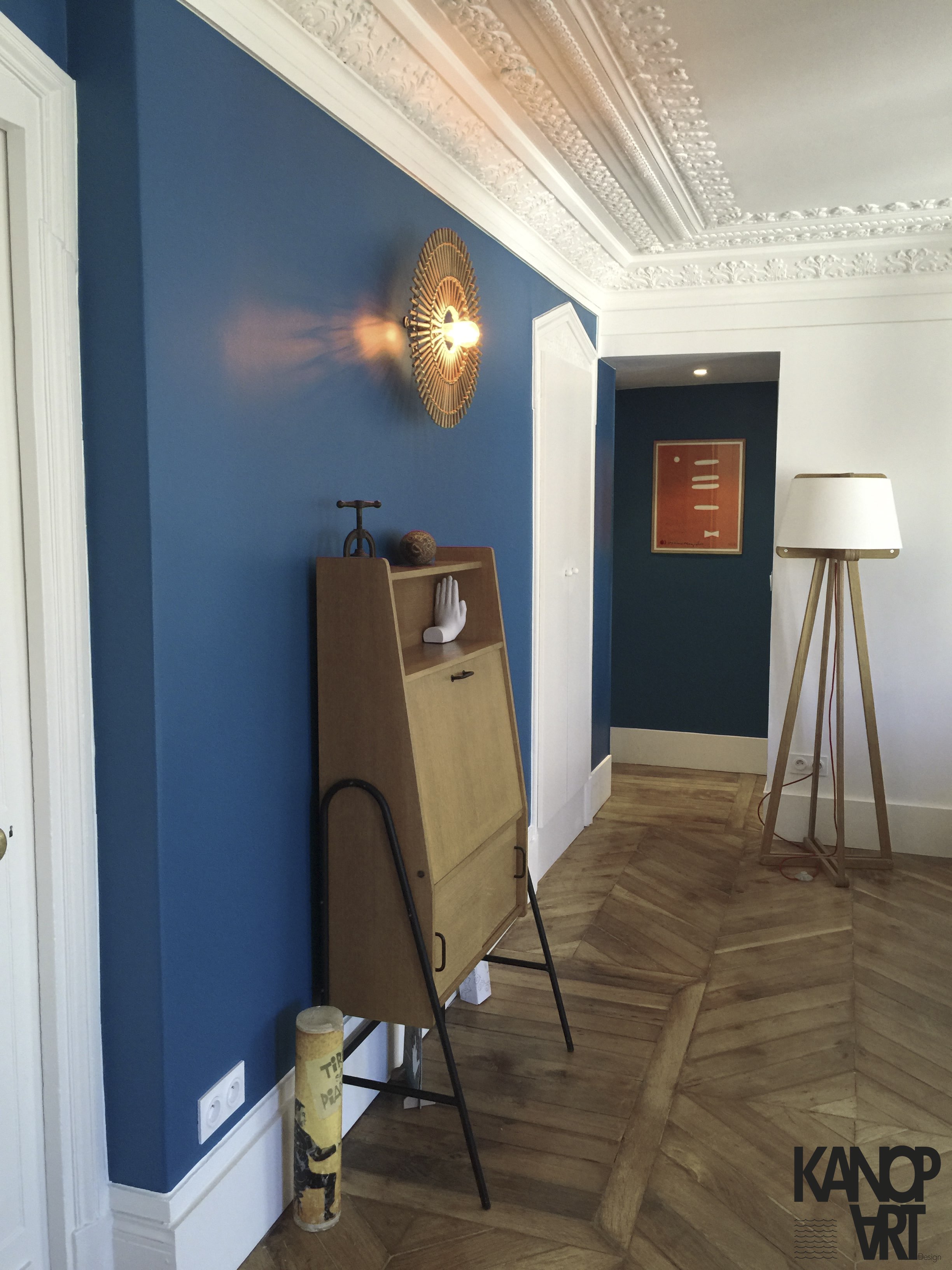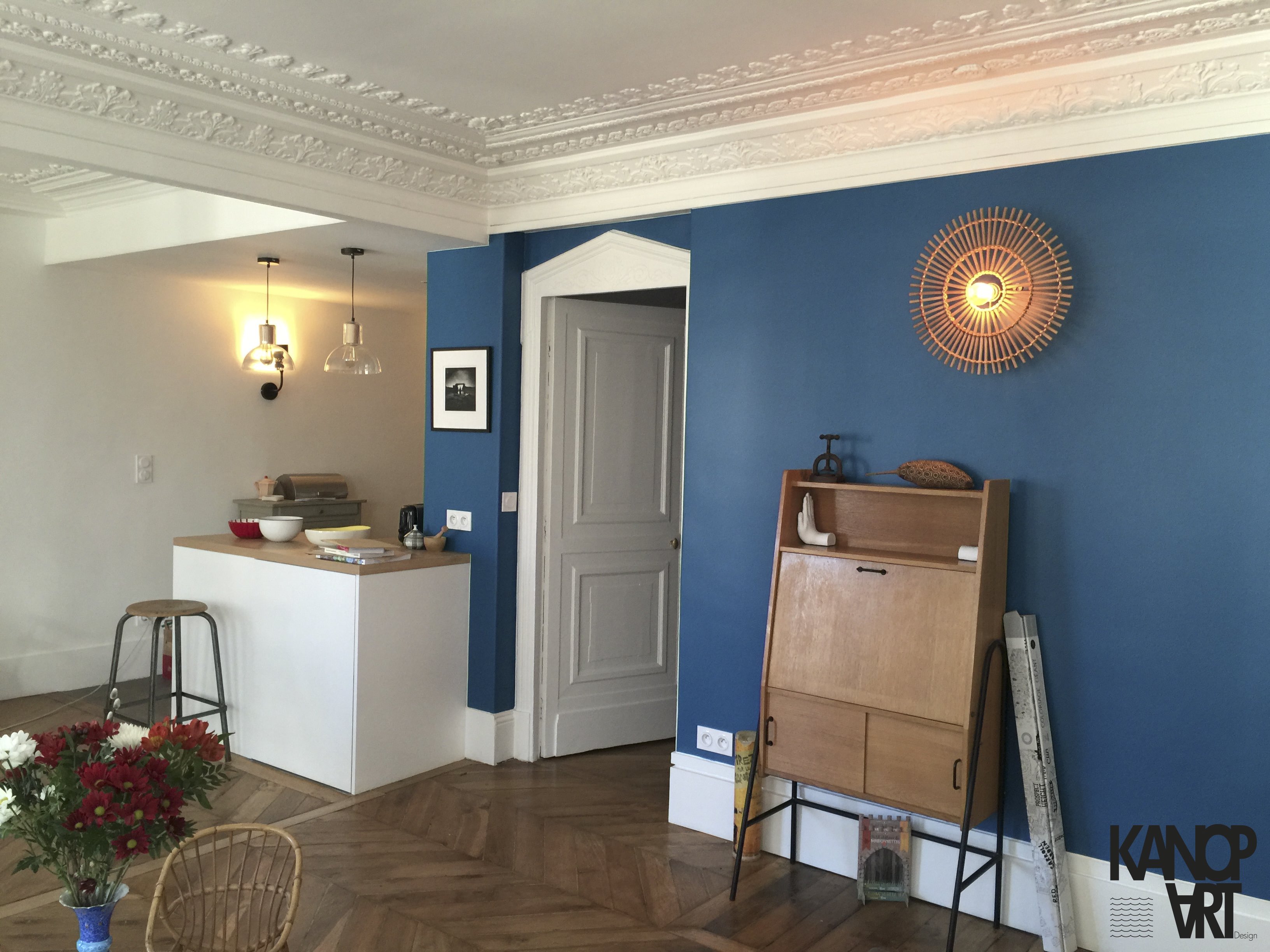 Cet appartement typiquement hausmanien , avec son parquet en pointe de hongrie et ses moulures aux plafonds, représente un défis par la modernité à y apporter.